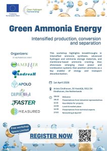 Join us for a free technical workshop on Green Ammonia Energy: intensified production, conversion and separation, co-organised by six EU-funded projects – AMBHER, ANDREAH, APOLO, CAIPIRINH3A, FASTER and MEASURED. The workshop explores how advanced ammonia technologies can accelerate support the EU’s climate neutrality, energy security and decarbonization objectives, in line with Horizon Europe impact priorities.